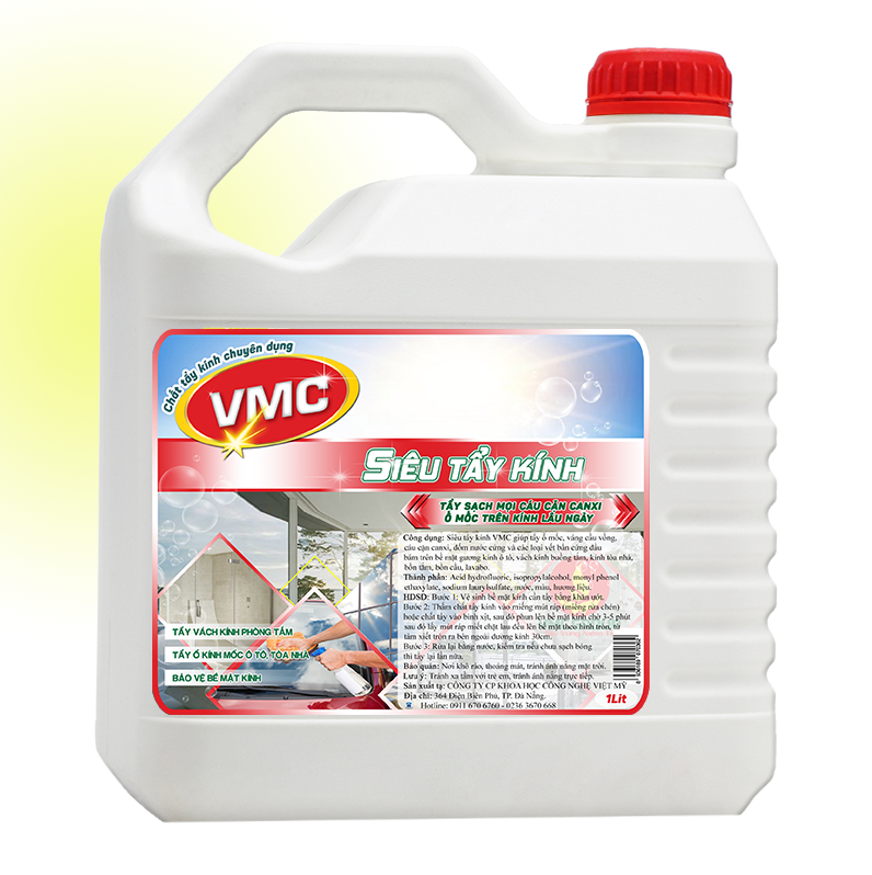 Siêu tẩy kính VMC giúp tẩy ố mốc, váng cầu vồng, cáu cặn canxi, đốm nước cứng và các loại vết bẩn cứng đầu bám trên bề mặt gương kính ô tô, vách kính buồng tắm, kính tòa nhà, bồn tắm, bồn cầu, lavabo.