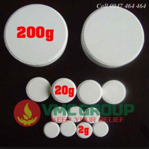 | 4.Hàm lượng/liều lượng tham khảo | • Khử trùng nước bể bơi – Viên khử trùng nhanh: sử dụng loại 2g và 20g o Sử dụng khi muốn làm tăng nhanh hàm lượng clo trong nước với liều lượng 10 viên 2g hoặc 1 viên 20g cho 1m3 nước. o Liều lượng duy trì: 100 viên 2 g hoặc 10 viên 20g cho cho 50-100m3 nước trong 2-3 ngày – Viên khử trùng chậm: viên 200g o Dùng để duy trì hàm lượng clo trong nước với liều lựơng 200g cho 40m3 trong 6-7 ngày. o Phải cho vào rổ lọc để hoà tan đều. Liều lượng trên chỉ là tương đối, vì vậy cần kiểm tra độ pH nước, độ clo và số lượng người bơi cũng như nhiệt độ của nước để điều chỉnh hoá chất sao cho phù hợp nhằm duy trì chất lượng nước trong bể tốt nhất. • Khử trùng nước sinh hoạt o Đối với cỡ bể trung bình và bể cỡ lớn: thả trực tiếp 1 viên 2g trong 400-800 lít nước sau 30 phút là có thể dùng được o Đối với 4 cỡ bể nhỏ, bể nước hộ gia đình: thả trực tiếp 1 viên 2g trong 500-1000 lít nước sau 30 phút là có thể dùng được Liều lượng còn phải căn cứ vào chất lượng nước để điều tiết cho phù hợp, sao cho hàm lượng clo duy trì mức 0.3-0.5g• Khử trùng môi trường và phòng dịch y tế cộng động o Khử trùng đồ đựng thức ăn: Liều lượng 1 viên 2g/4lít nước. Ngâm vào dung dịch trong vòng 30 phút sau đó rửa lại bằng nước sạch o Khử trùng đồ vật, máy móc thiết bị y tế, quần áo, chăn màn:Liều lượng 1 viên 2g/2lít nước.Dấp nước lau chùi hoặc phun lên, sau 15 phút sẽ có tác dụng o Khử trùng môi trường xung quanh: Liều lượng 1 viên 2g/1lít nước. Hoà ra phun đều vào không khí hoặc lau nhà o Khử trùng đồ đựng chất thải và buồng vệ sinh của bệnh nhân: Liều lượng 10-20 viên 2g/1lít nước. Ngâm sau 30-60 phút rồi rửa lại bằng nước sạch. Liều lượng trên chỉ là tương đối, trong trường hợp có dịch bệnh xảy ra thì tuỳ thuộc vào điều kiện môi trường cụ thể mà sử dụng liều lượng tăng lên cho phù hợp.• Khử trùng cho tôm cáo Xử lý đáy hồ: nhằm mục đích tiêu diệt các mầm bệnh tích tụ dưới đáy hồ của những vụ trước đó. Liều lượng 15 viên 2g cho 1m3, phơi hồ 3 ngày sau đó hoà thuốc vào nước và phun đều khắp hồ, sau 3-5 ngày sau cho nước và thả giống xuống nuôi o Xử lý nước trước khi nuôi tôm: mục đích tiêu diệt các mầm bệnh có trước khi nuôi tôm. Liều lượng 15-25 viên 2g cho 10m3. Sau khi khử trùng 5-10 ngày thì thả giống. o Phòng bệnh: mục đích tiêu diệt và hạn chế mầm bệnh phát sinh trong khi nuôi, phòng chống dịch bùng phát và lây lan. Liều lượng 2-3 viên 2g cho 10m3 sau 15-30 ngày dùng 1 lần o Phòng và trị bệnh ngoại ký sinh:giúp phòng bệnh ký sinh trùng như rận cá và cá tạp. Liều lượng 5-8 viên 2g cho 10m3 dùng 2-3 lần mỗi lần cách nhau 3 ngày. o Khử trùng dụng cụ ươm nuôi: chài lưới, đồ đựng giống. Liều dùng 10-20g/m3ngâm qua 1 đêm Liều lựơng trên có thể thay đổi tuỳ thuộc vào điều kiện thời tiết, địa hình, môi trường nước, tình hình dịch bệnh. |
